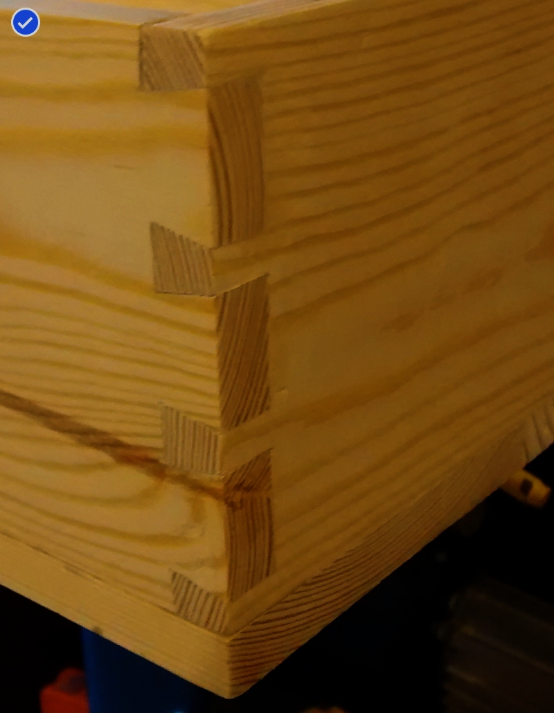 The sides are joined to the front and rear by 8 dovetails. The base is nailed on.